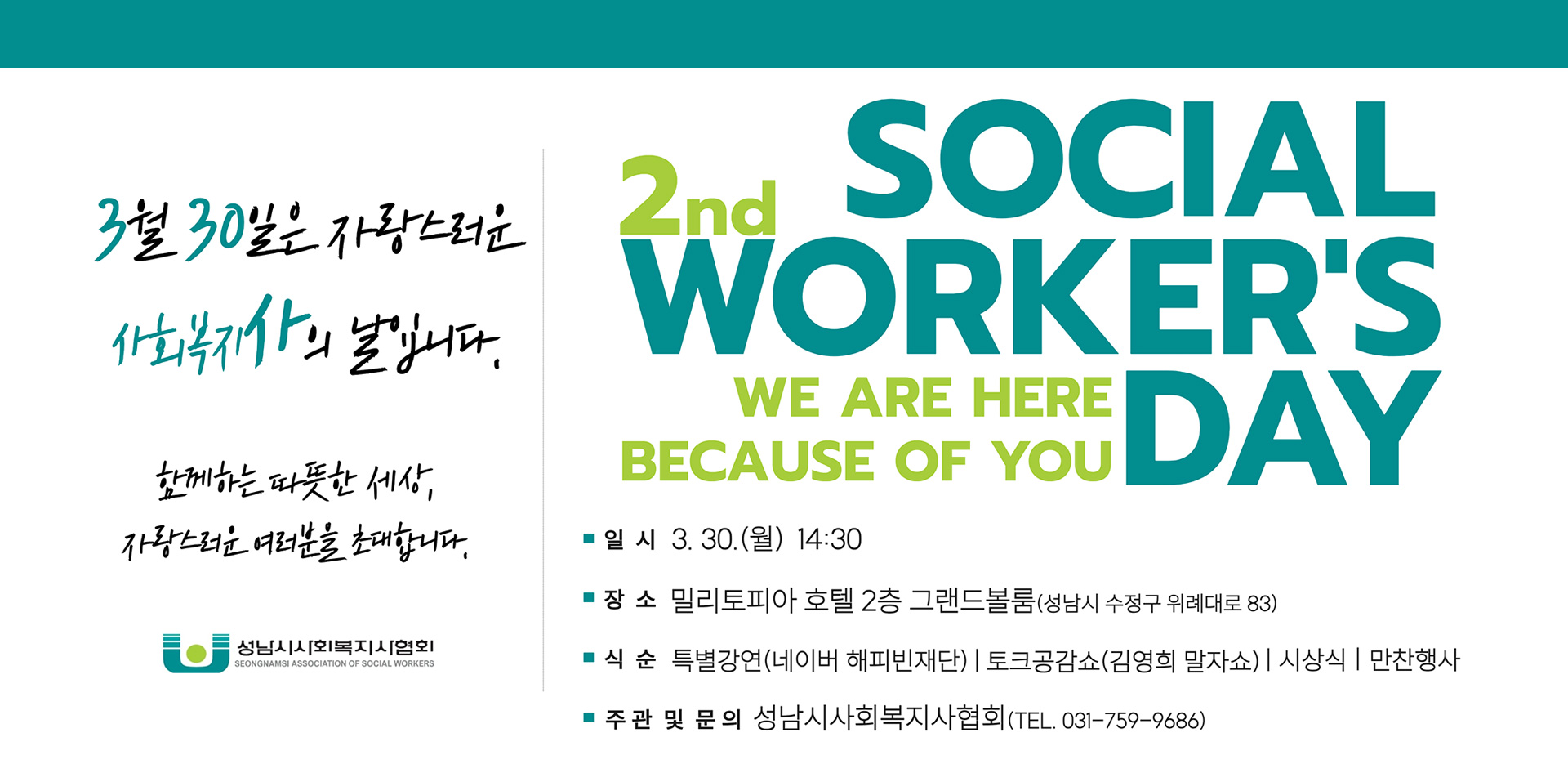 성남시 사회복지사들의 헌신과 노고를 기리는 제1회 성남시 사회복지사의 날 기념행사가 개최됩니다! 이번 행사는 사회복지사분들의 사기 진작과 시민과의 교류를 확대하기 위해 마련된 뜻깊은 자리로, 다양한 프로그램과 이벤트가 준비되어 있습니다. 성남시 사회복지사분들의 노고를 격려하고, 시민과 함께하는 소통의 장을 만들고자 하니, 많은 관심과 참여 부탁드립니다!